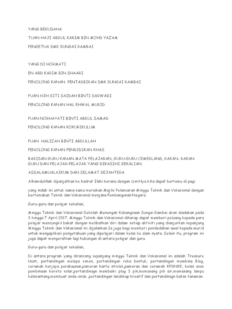 Teks ucapan majlis pelancaran transformasi pendidikan vokasional. Terima kasih puan pengerusi majlis. Teks ucapan pengerusi majlis mengumumkan, ketibaan, barisan vip diiringi pengarah program masuk ke dewan. Teks ucapan pengerusi tetap pemuda. Yang diraikan tuan haji abdullah bin mohd.