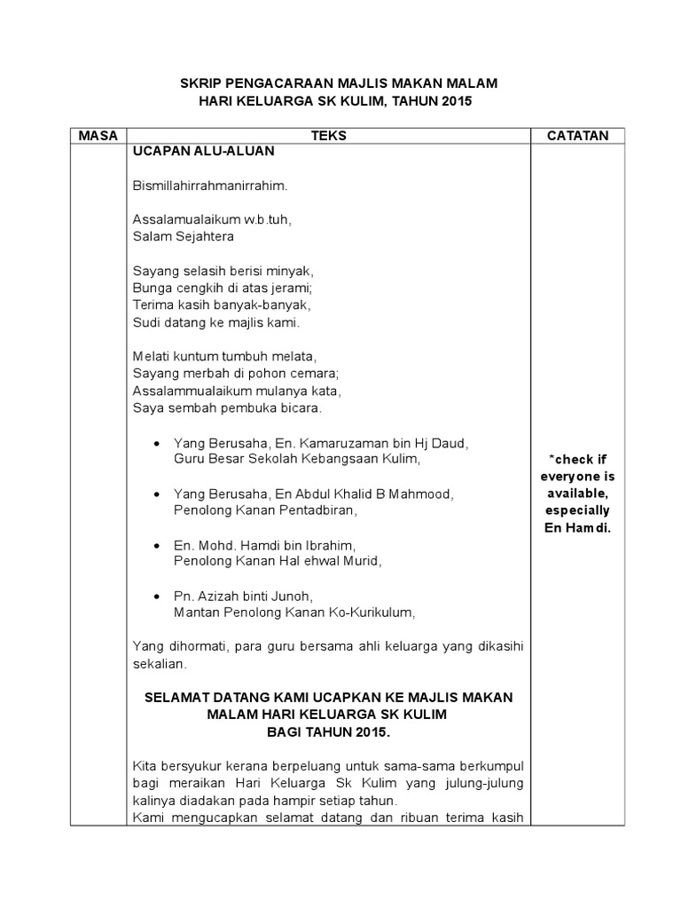 Terima kasih kepada semua hadirin dan hadirat sekalian. Tulis ulang teks secara gratis! Teks pengacara program / bengkel. Itulah saatnya kita merayakan tanggal penting dan mengikat hari dimana kita lahir ke dunia. Please fill this form, we will try to respond as soon as possible. Tuan haji mohd nasarruddin bin ahmad. Mengumumkan ketibaan yang berusaha encik nordin bin rukani, penyelia unit kokurikulum, pejabat pelajaran daerah pasir gudang. Untuk memberkati lagi majlis kita pada hari ini saya menjemput dan mempersilakan saudara zul hasanain bin hasim untuk mengaminkan. Antaranya ialah teks pengacara majlis. Contoh teks terbaik dan lengkap dari mula program sehingga akhir penutup. Pada bulan julai yang lalu kita semua sedang menjalani ibadah puasa justeru itu sambutannya. Masuk ke perkarangan majlis, para hadirin diminta untuk berdiri. Ketika saat tanggal ulang tahun umumnya.