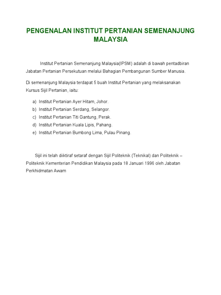 Program sijil pertanian ditawarkan kepada individu yang meminati bidang pertanian bagi membantu transformasi sektor pertanian negara. Pusat pertanian ayer hitam, 86100 ayer hitam, johor. 145 institut pertanian ayer hitam jabatan pertanian malaysia 146 institut pertanian bumbung lima jabatan pertanian malaysia 147 institut pertanian kuala lipis, pahang jabatan pertanian malaysia 148 institut pertanian semongok, sarawak jabatan pertanian malaysia 149 institut sosial malaysia kementerian pembangunan wanita, keluarga dan masyarakat 📍 padang a dan padang b, angsana mall johor bahru. Institut pertanian ayer hitam kotak berkunci 101, 86100 ayer hitam johor.